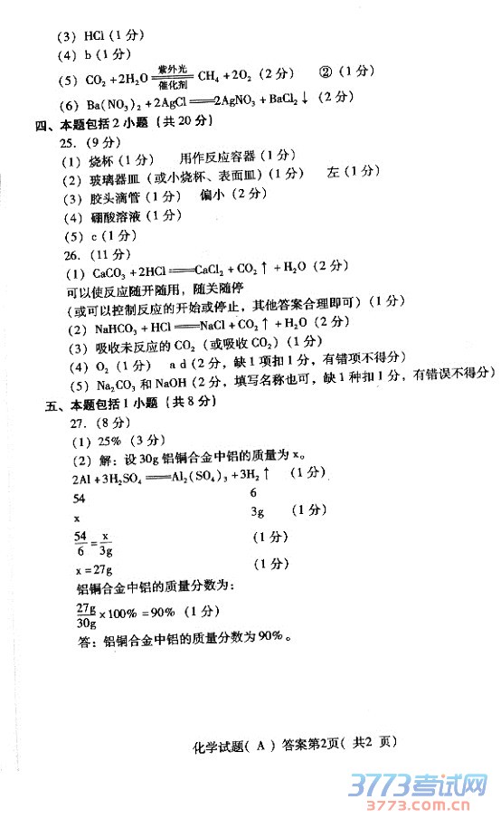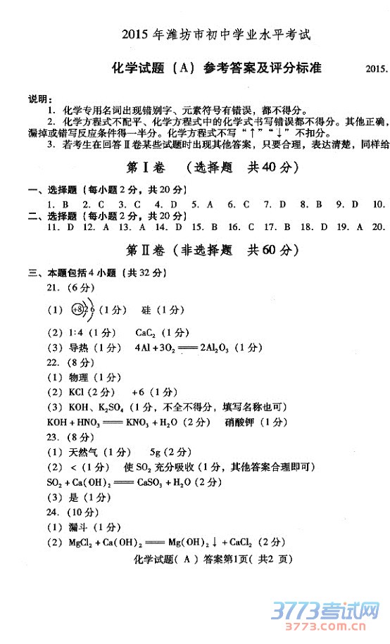 [组图]2015潍坊中考化学试题及答案评分标准发布