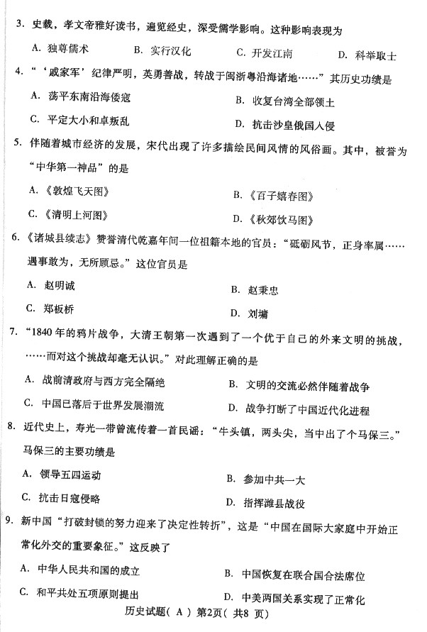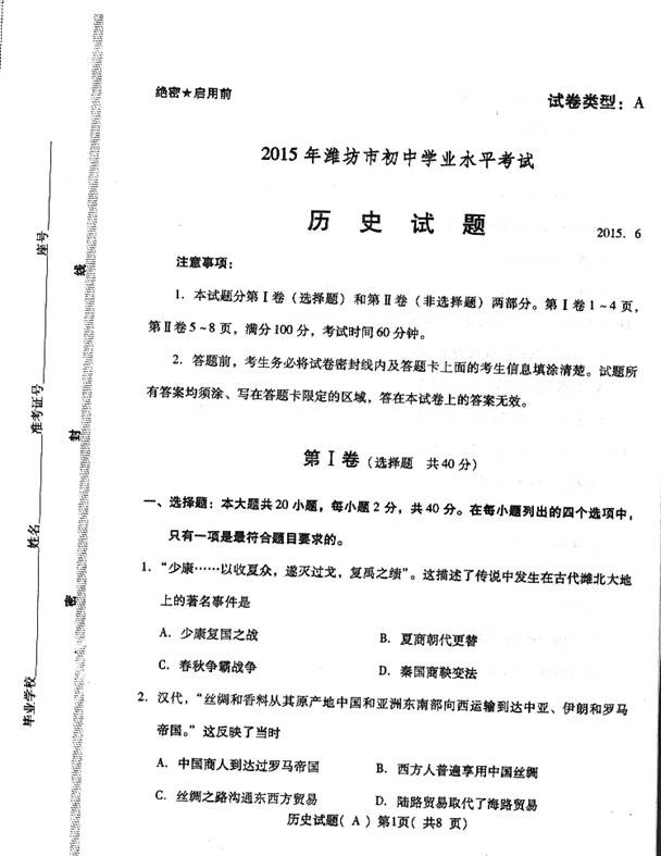 及时公布山东中考试题、答案和高考作文。祝各位考生都能取得好的成绩。2015年山东潍坊中考历史试题及答案(图片版):