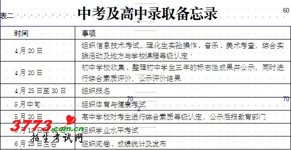 2月27日,山东省潍坊市教育局召开了全市高中招生工作会议,会上发布了《2012年潍坊市初中学业水平考试及高中招生录取工作意见》。潍坊市2012年中考考生报名时间为4月25日至30日,考试时间为6月12日至15日。与往年不同的是,今年普通高中、职业学校统一填报志愿,学生填报普通高中志愿时,同时填报一处职业学校志愿;另外,部分科目考试顺序也有所调整。 考试 科目考试时间有微调 2012年潍坊市初中学业水平考试报名时间为4月25日至30日。考试科目仍为语文、数学、英语、物理、化学、思想品德、历史、地理、生物9科,实行全市统一组织考试。 考试时间仍为6月12日至15日,但和往年不同的是,今年市教育局将部分科目的考试时间进行了微调(见表一),将思想品德、历史两科目的考试时间从原来的6月14日下午分别调到6月12日、13日下午。将6月14日下午空出来,方便下一场参加地理和生物考试的学生来看考场。 和去年一样,初一、初二的学生也可以参加此次考试,由考生提出申请,学校批准即可。初一学生可以参加地理、生物考试,初二学生可以参加除了化学以外其他科目的考试。 安全知识将纳入中考 各科的考试内容将在加强知识与能力考查的同时,重视过程方法和情感态度价值观的考查。除考查课程标准要求的识记内容外,不考查对形成学科素养和学生后续学习无益或意义不大的死记硬背、机械训练性质内容。不追求对知识的全覆盖,重点内容重点考查,加强对高中阶段学习乃至终生学习影响较大的知识和能力的考查,给学生留有较大思维空间。 考试内容还将加强与社会实际、学生生活和成长经验的联系,注重考查学生在真实情境中发现问题、研究问题、解决问题及收集、整合、运用信息的能力。 另外,从2013年起,中考将在思想品德科目中增加对学生安全常识和相关防护技能的考查,考查依据是山东省义务教育必修地方课程教科书《安全教育》(试用),占10%的权重。 只通知考生考试等级 初中学业水平考试分考试科目和考查科目两类。考试科目除了6月12日起开考的语文、数学、英语、物理、化学等9科外,还有体育与健康和信息技术。体育与健康考试与理化生科目等值对待,考试项目另行发布。考查科目包括理化生实验操作、音乐、美术、综合实践活动及地方与学校课程5科,其成绩分A、B、C三个等级,A等不得超过考生总数的30%,作为高中招生录取的依据。 考试科目中,语数外满分各为120分,物理、化学、思想品德、历史、地理、生物考试满分各为100分。考试科目各科成绩均用分数表达、等级呈现,均设A到E五个等级。得分为满分的90%(含)以上为A等,90%以下至80%(含)之间为B等,80%以下至70%(含)之间为C等,70%以下至60%(含)之间为D等,不足60%为E等。 如果按照分数划定,使得A等不足考生总量的15%、B等不足考生总量的20%、C等不足考生总量的30%、D等不足考生总量的20%时,则分别按考试总人数的15%、20%、30%、20%的比例划定;如果超过上述比例则按照实际人数划定,超出的部分从E等中扣减,但A等最多不超过20%。 对独生子女,在语数英三科原始分数最低的一科加5分后,再划分等级。各考试组织部门(含民办高中)要通过适当方式将考生考试等级通知本人,不得通知考生原始分数。考生成绩属于个人隐私,任何单位和个人不得以任何方式公布考生成绩。 招生 统招生60%为指标生 普通高中录取学生包括统招生和择校生。根据省政府要求,2012年,我市继续将普通高中招生计划中统招生计划的60%分配到高中服务区内各初中学校(即指标生)。分配原则是:初中毕业生人数和初中学校素质教育工作评价得分各占50%。其中,初中学校素质教育工作评价要将学生家长对初中学校办学满意度测评结果作为重要指标,所占权重不得低于10%。 市属普通高中学校的指标生名额,先由市教育局根据指标生分配办法分配到奎文区、潍城区、高新区、原经济开发区和市属初中学校,然后再由各区教育部门按要求分配到所属初中学校。指标生录取标准今年仍有下限,不得低于择校生录取标准。 据了解,为了促进教育公平,从2013年起,原则上指标生应是初中一年级即在毕业学校入学并有正式学籍的学生,因家庭住址变化、户口迁移、进城务工等因素而正常转学的学生也应在毕业学校连续学习两年以上,并有符合规定的学籍档案。另外,从2011年入学的初一学生起,到公办初中学校择校就读的学生不享受普通高中指标生政策。 高中职校可统一填报 2012年,潍坊市高中招生工作的变化之一是普通高中和职业学校将统一填报志愿。也就是说,中考考生志愿将有两类,普通高中和职业学校,具体由各县市区确定。 往年中考招生中没有列入职业教育招生,学生在中考后填报志愿时只填报普通高中志愿。而从今年开始,中考后学生填报志愿时,普通高中志愿和职业学校志愿统一填写(职业学校春季招生的学生,不需填志愿,只需参加学业水平考试)。录取时,普通高中、职业学校分别录取,首先按普通高中志愿录取,所以考生可以大胆地填报职业学校志愿。 高中学校录取时,仍根据等级组合录取,严禁以赋值、代码等形式进行变相录取。等级组合录取即把综合素质视为一门学科,将其与各学科分成三至五个组合,一般分三个组合:综合素质与语数英为第一组合,体育与健康和物理、化学为第二组合,思想品德、历史、地理、生物为第三