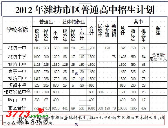 2012年潍坊市区八所高中共招生10858人(各校计划详见表格),比去年多了1058人。普通高中招生计划分为普通生、艺体特长生两大类。普通生计划中,潍坊一中比去年增加170人计划,潍坊中学增加220人计划,潍坊七中比去年增加180人计划。