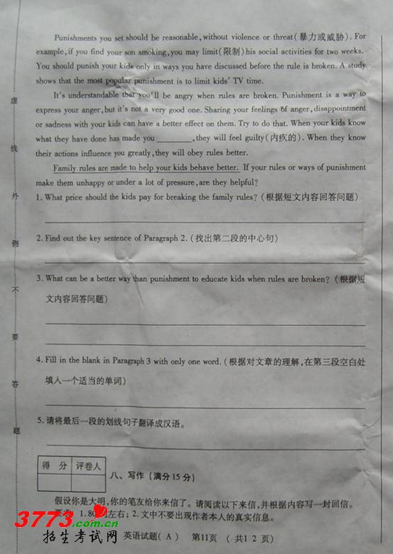 [组图]2012年潍坊中考英语试题答案及评分标准
