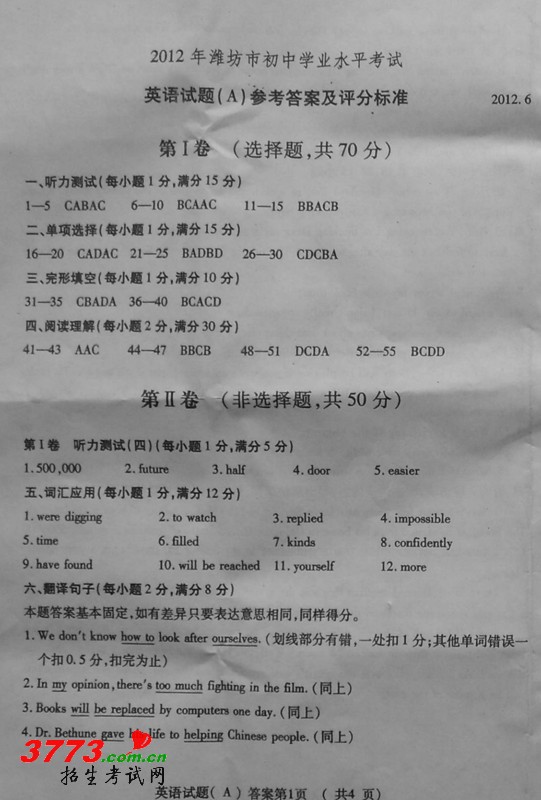[组图]2012年潍坊中考英语试题答案及评分标准