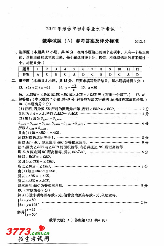 [组图]2012年潍坊市中考数学试题及答案