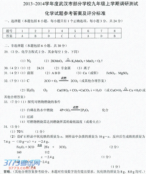 2013-2014学年度武汉市部分学校九年级调研测试化学试卷参考答案及评分标准 2014武汉初三元月调考化学试卷答案及评分标准2013-2014学年度武汉市部分学校九年级调研测试化学试卷参考答案及评分标准
