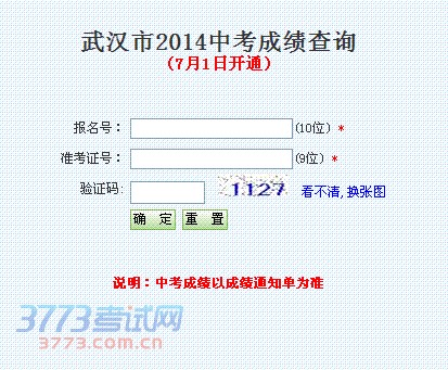 2014年武汉市中考成绩将于7月1日上午10:00公布。届时,武汉招考网(www.whzkb.cn)、号码百事通118114-8-9(免信息费)将提供免费查询。考生成绩通知单将由毕业学校发至考生手中。