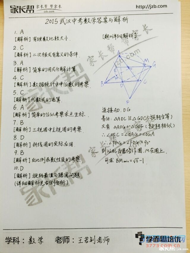 [组图]2015年武汉中考数学试题及答案发布