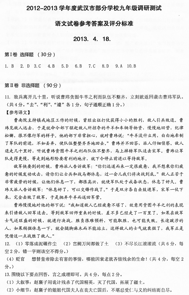 [组图]2013武汉初三四月调考语文试题答案