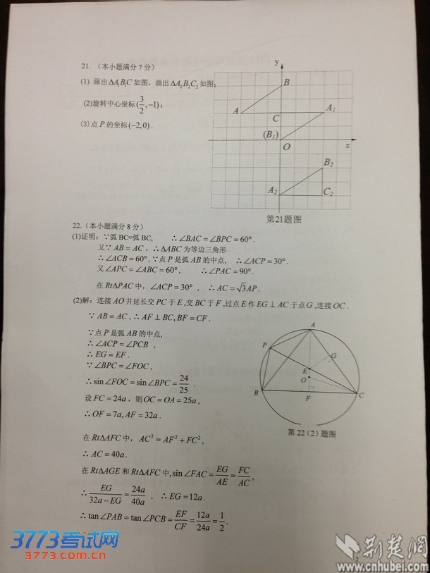 2013年武汉市中考试卷(数学卷答案第二页)