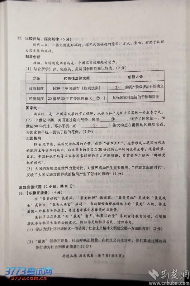 2013年武汉市中考试卷(历史思想品德及答案)第七页