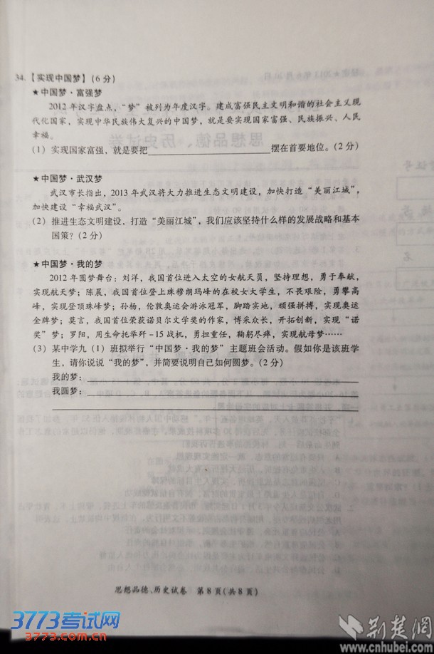 2013年武汉市中考试卷(历史思想品德及答案)第八页