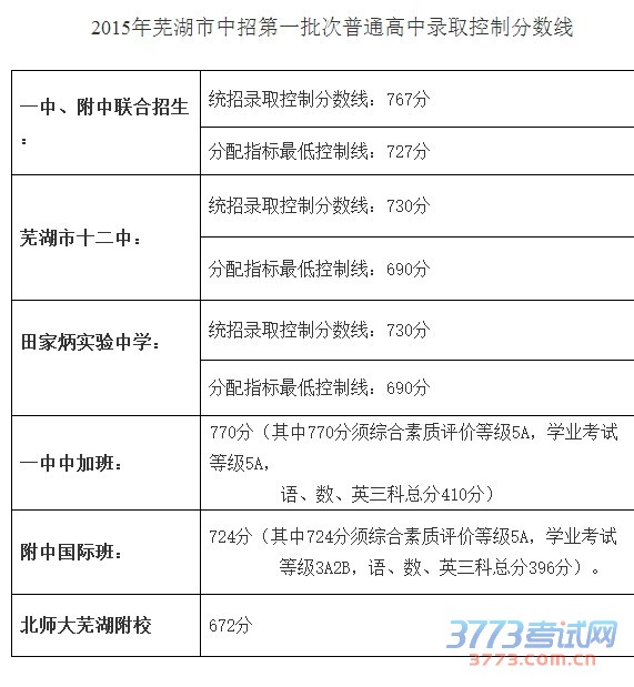 2015芜湖一中、附中联合招生分数线