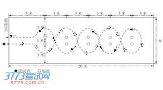 测试场地长20米,宽7米,设标志杆10根(杆高1.2米以上)。