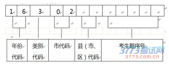 第1-2位为年份代码,全省统一编为16;第3位为考生类别代码,参加当年中考的考生全省统一编为3;第4-5位为市代码,我市为02;第6-7位为县(市、区)代码,具体为:市区01、无为县25、芜湖县21、繁昌县22、南陵县23;第8-12位为考生报名顺序号,顺序号以县(市、区)为单位从00001号开始连续编排,中间不得出现重号。