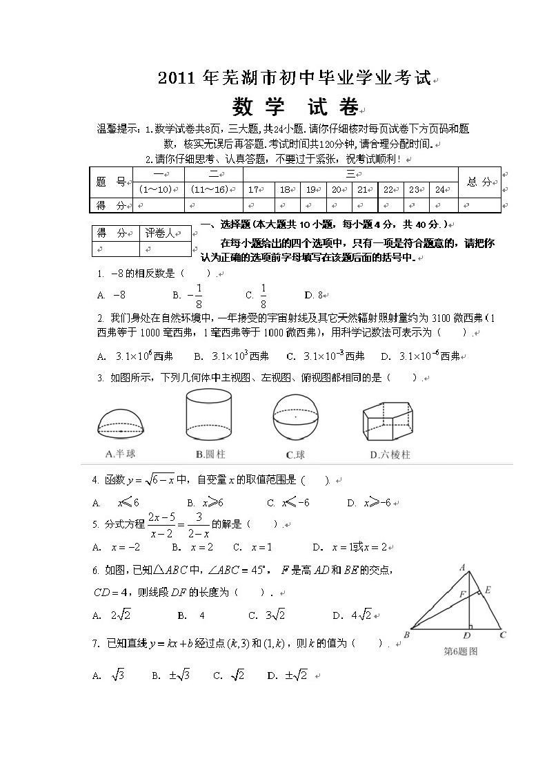 [组图]安徽芜湖2011中考数学试题