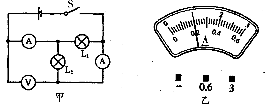 12.如图甲所示的电路中,闭合开关S后,电压表的示数为4V,两个电流表的指针偏转至表盘的同一位置(如图乙), 则