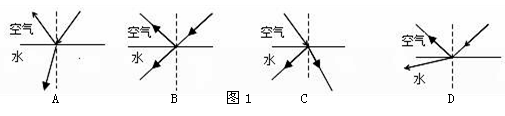 4、图1中画出了光线射到空气与水的界面处发生折射和反射的四幅光路图,其中正确的光路图是( ▲ )