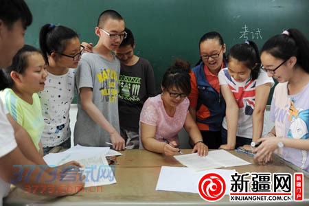 6月26日,在乌鲁木齐市第80中学初三(5 )班教室内,班主任喻兰在教考生估分技巧。