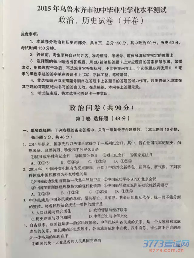 [组图]2015乌鲁木齐中考政治历史试卷及答案评分标准