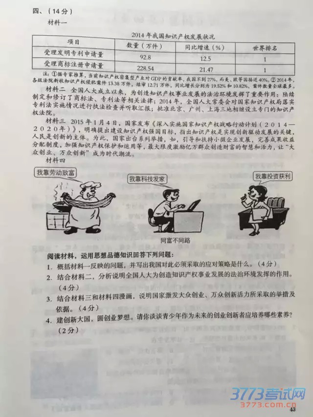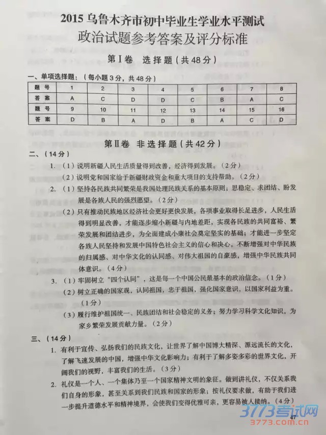 [组图]2015乌鲁木齐中考政治历史试卷及答案评分标准