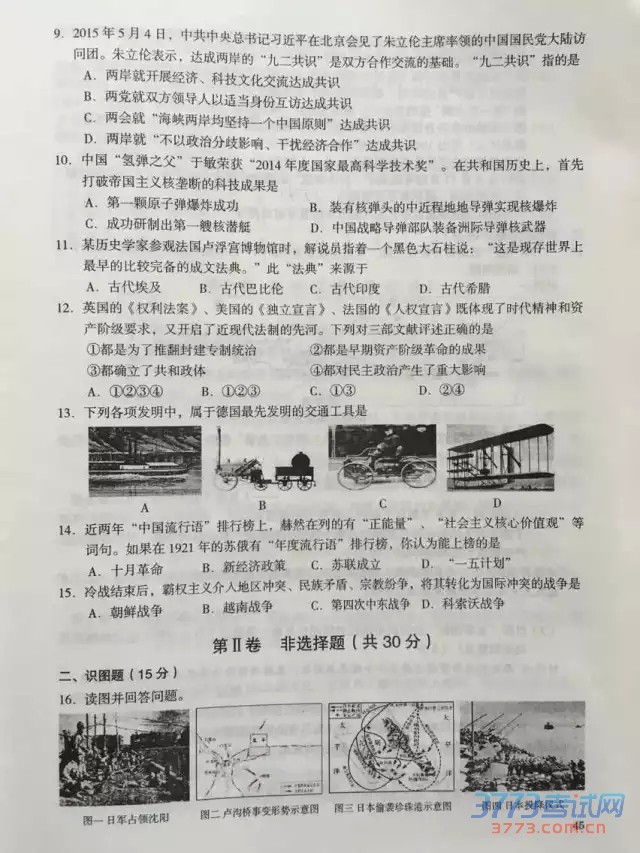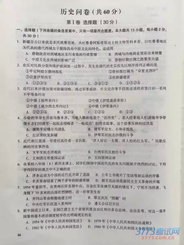 公布新疆中考试题、答案和中考作文。祝各位考生都能取得好的成绩。2015年新疆中考历史试题及答案(图片版):