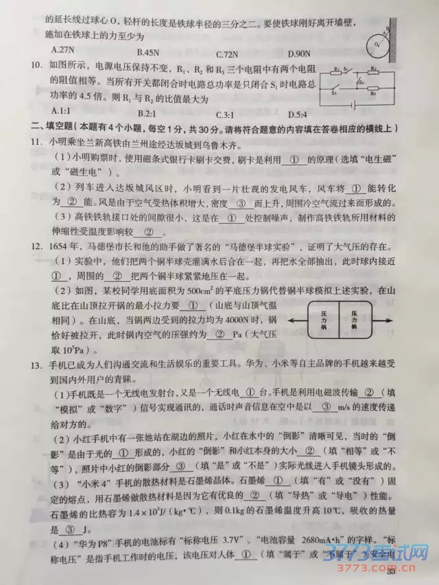 [组图]2015乌鲁木齐中考物理试题及答案评分标准