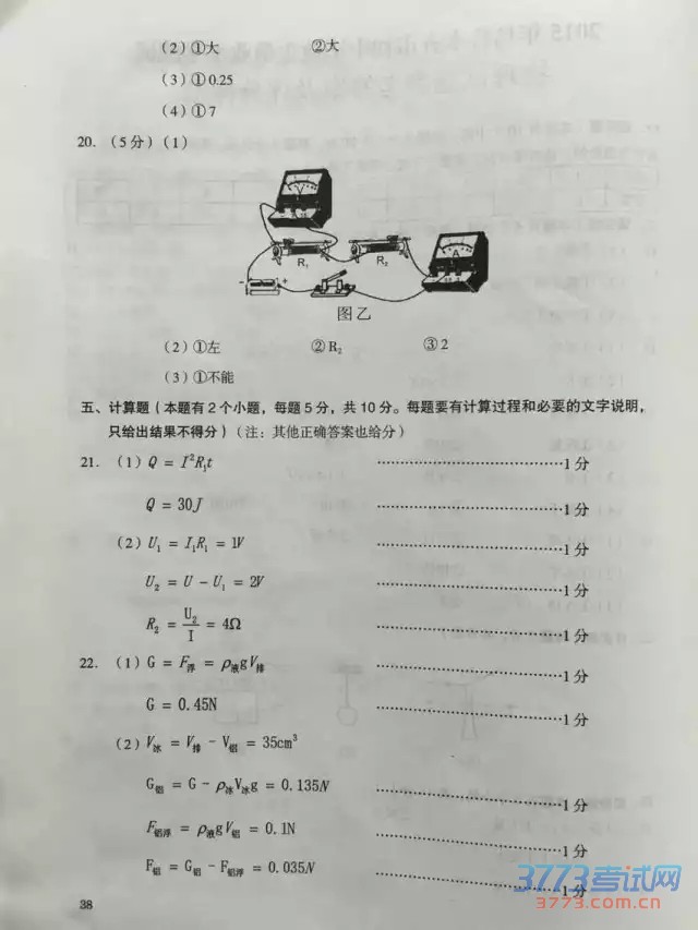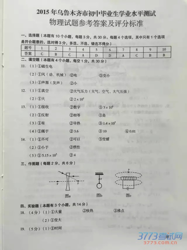 [组图]2015乌鲁木齐中考物理试题及答案评分标准