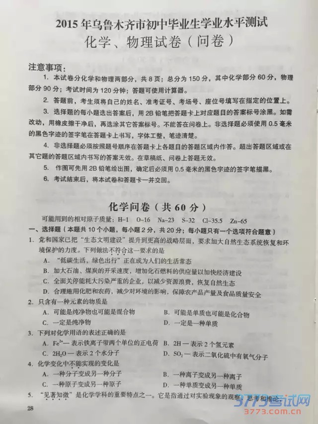 [组图]2015乌鲁木齐中考化学试题及答案评分标准