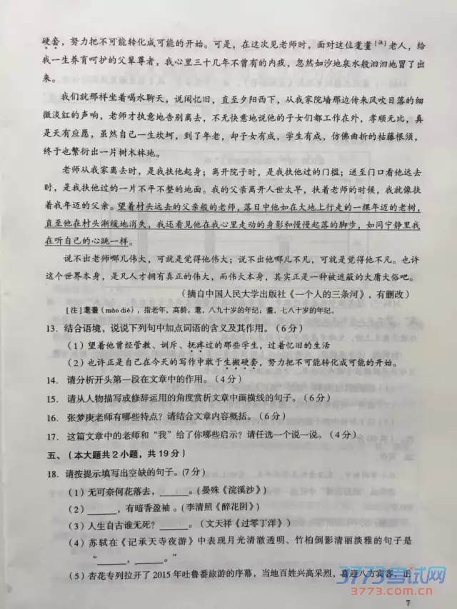[组图]2015乌鲁木齐中考语文试卷及答案评分标准