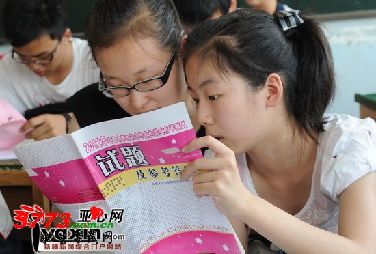 6月28日,乌鲁木齐市第70中学中考考生回到学校估分,为填报支援作准备。图为:考生用印发的标准答案认真估分。