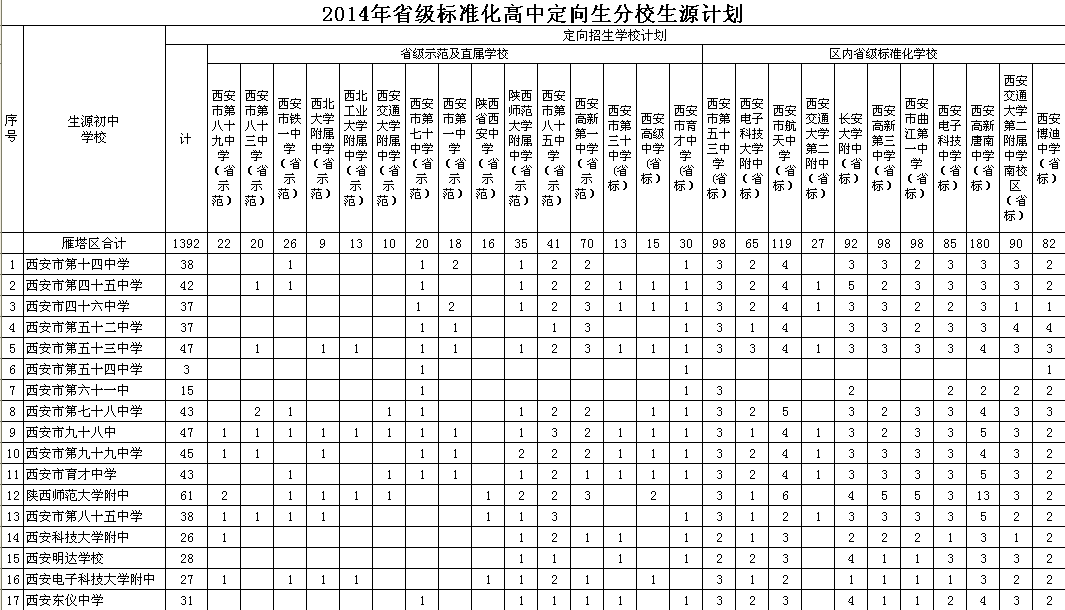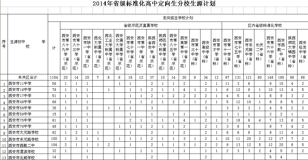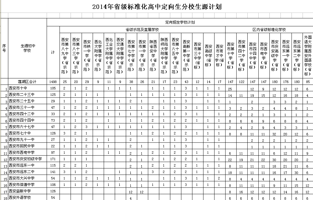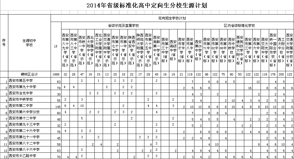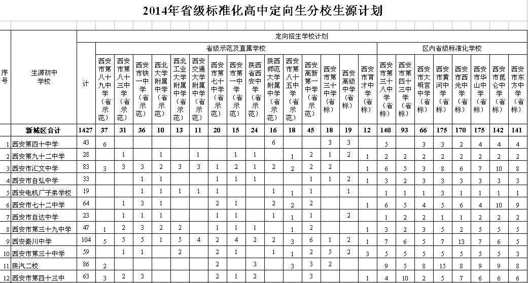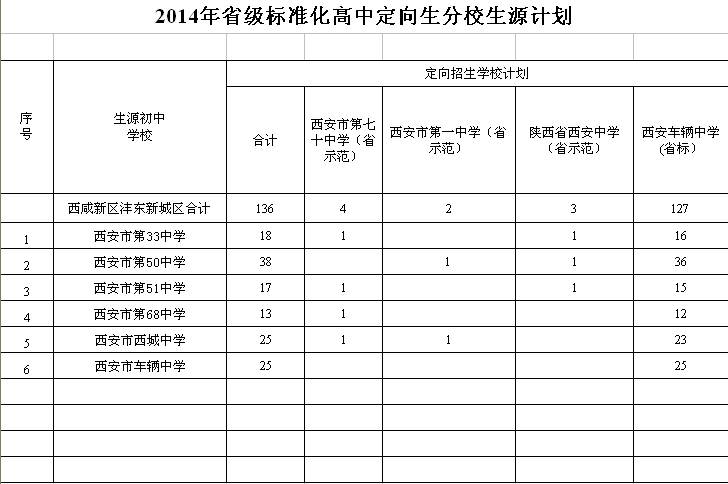 为贯彻执行《中华人民共和国义务教育法》,努力促进义务教育均衡发展,构建教育公平和谐,根据《西安市教育局关于加强2014年普通高中定向生招生管理的通知》(市教办发[2014]93号)的要求,我局审定了西安市2014年城六区及西咸新区沣东新城省级标准化高中定向生分校生源计划。现印发你们,请遵照执行,并要求如下: