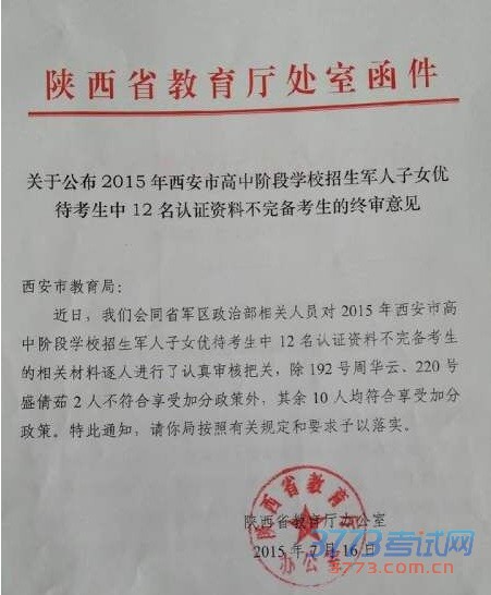 按照国家、陕西省和西安市关于高中阶段招生军人子女优待政策的相关规定,做好军人子女高中阶段学校招生优待工作,保障军人子女接受良好教育,同时确保我市高中阶段学校招生工作的公平、公正,陕西省军区政治部、陕西省教育厅和西安警备区政治部按照相关政策对我市参加2015年高中阶段招生考试的319名军人子女考生的资格进行了严格的审查,目前审查工作已经结束。按照省教育厅要求,现将陕西省军区政治部、陕西省教育厅下达的西安市2015年高中阶段学校招生军人子女优待对象终审名单予以公示。公示期间如有异议,请及时反映。
