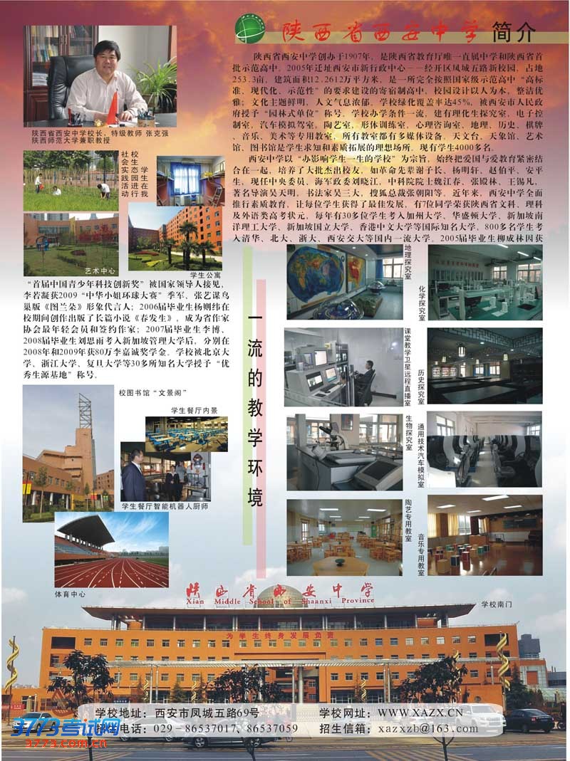 陕西省西安中学是陕西省教育厅唯一直属中学,是陕西省首批示范高中,创建于1905年,迄今有一百多年的办学历史,具有深厚的文化底蕴和优良的办学传统,以卓著的办学成果闻名遐尔,被誉为“三秦明珠,人才摇篮”。学校位于国家级西安经济开发区凤城五路,占地248亩,校园环境优美典雅,文化氛围浓郁,师资力量雄厚,教学设备先进,实行寄宿制管理,在校学生4000余人。