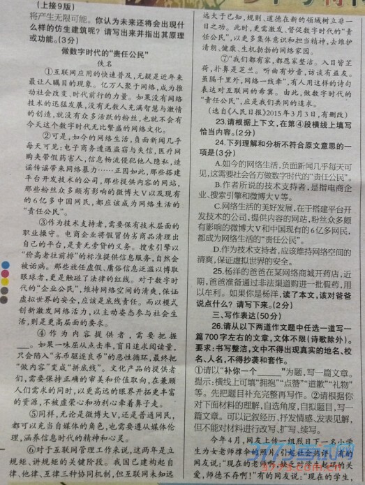 湖北省孝感市2015年中考语文试题(扫描版,含答案