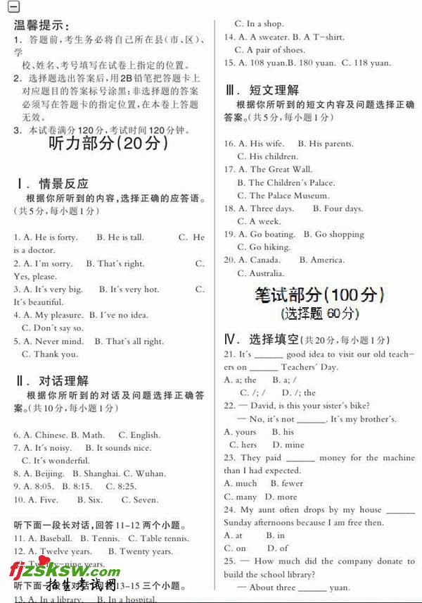 孝感市2011年中考英语试题卷注意事项1、本试卷满分120分 考试时间120分钟听力部分 20分 1、情景反应根据你所听到的内容 选择正确的应答语 共5分 每小题1分