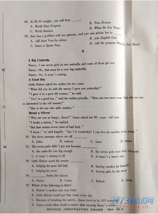 [组图]2015年新疆中考英语试题(含兵团)发布