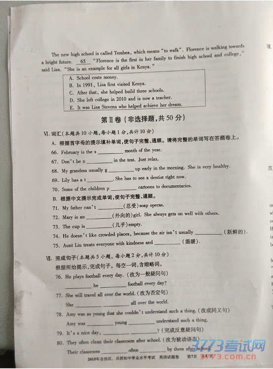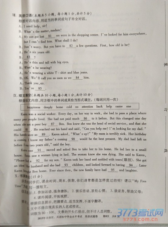 [组图]2015年新疆中考英语试题(含兵团)发布