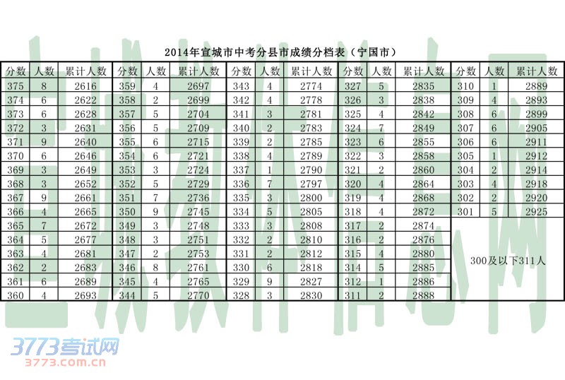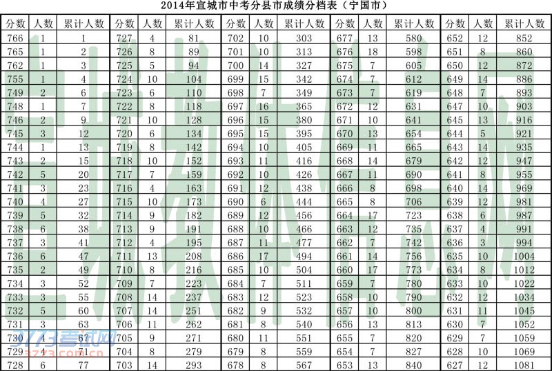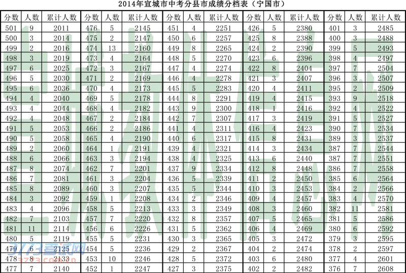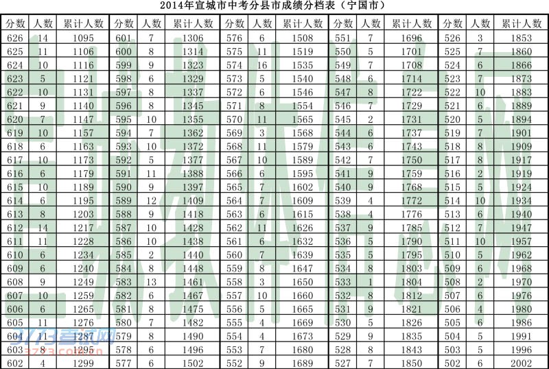 宣城市2014年初中毕业学业考试(宁国市)成绩分档表