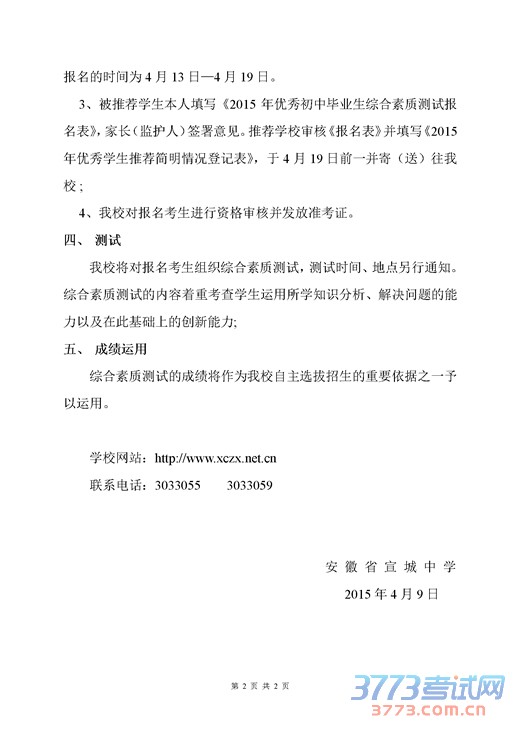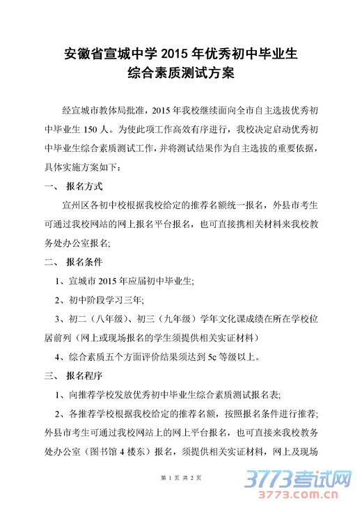 宣城中学2015年优秀初中毕业生综合素质测试方案(含表格下载)