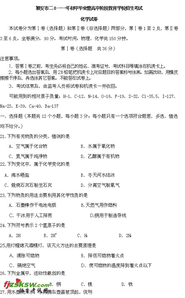 [组图]四川雅安2011年中考化学试题及答案