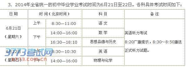 2014年全省统一的初中毕业学业考试时间为6月21日至22日。各科具体考试时间如下: