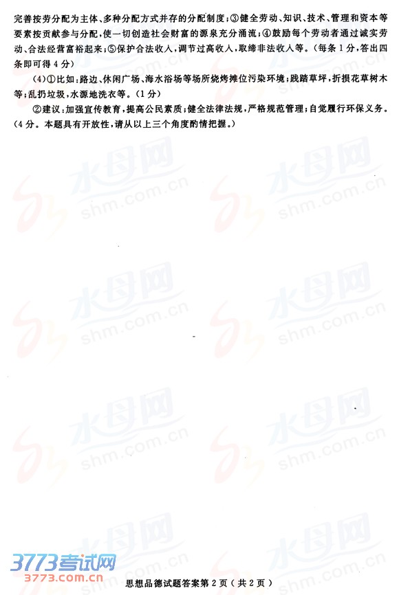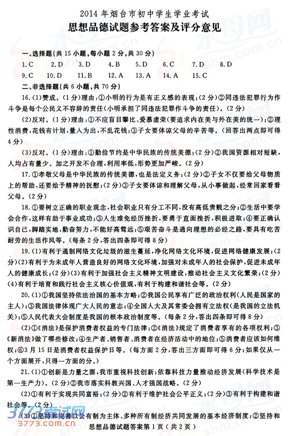 [组图]2014烟台中考思想品德答案及评分标准发布