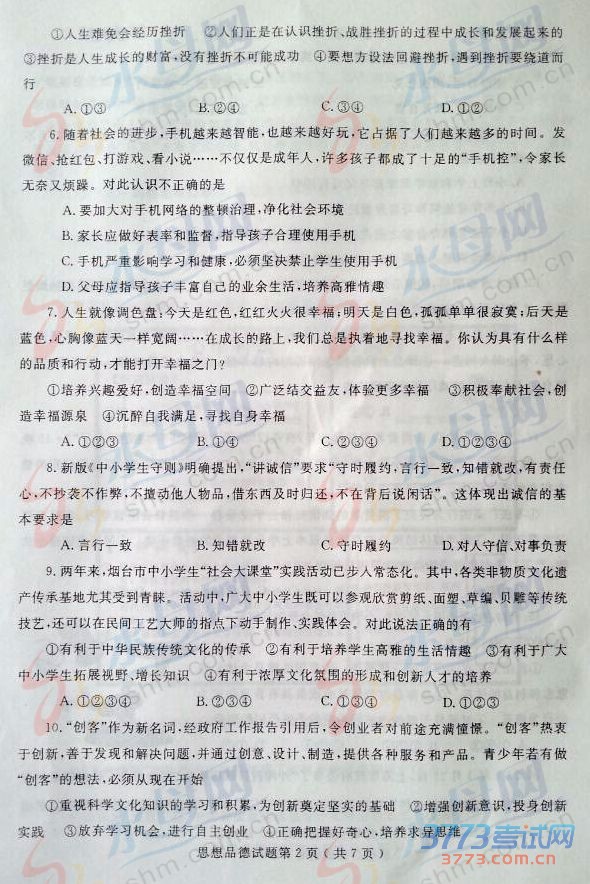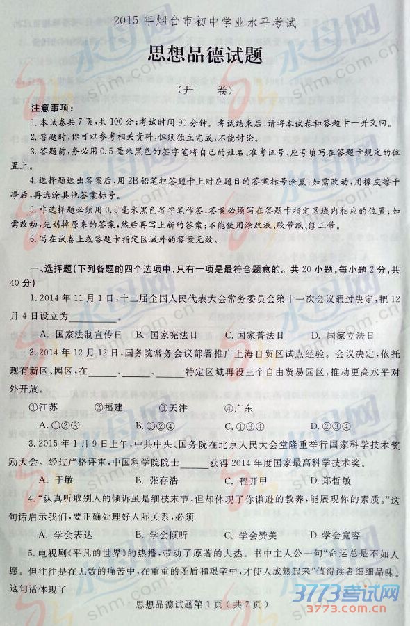 水母网整理出了2015烟台中考思想品德试题,供大家浏览。