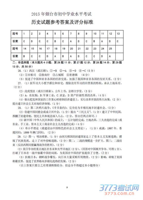 [组图]2015烟台中考历史试题及答案评分标准