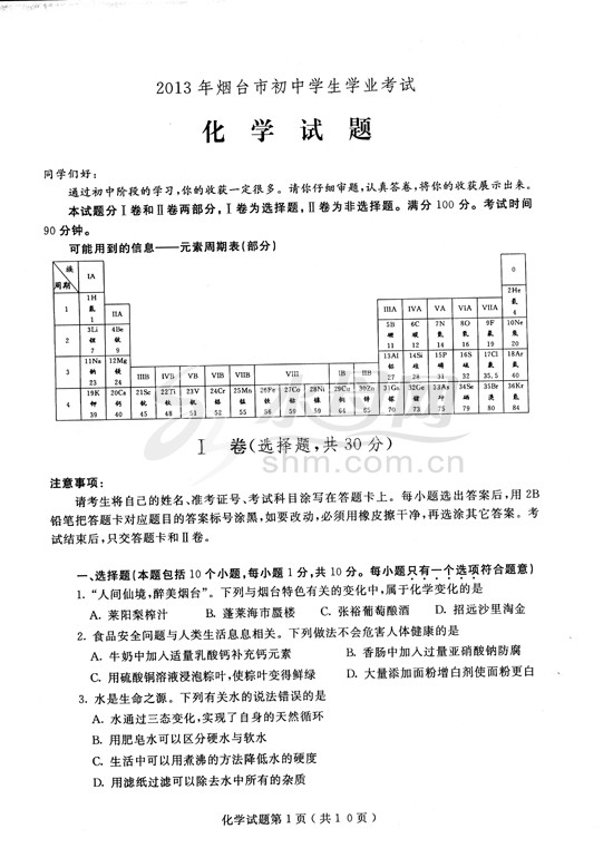 [组图]2013烟台中考试题及答案:化学试卷及答案发布