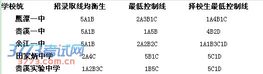 另悉,鹰潭市一般高中投档线为:贵溪四中投档线:1B5C,余江二中投档线:6C,余江三中投档线:5C1D。同时,民办学校实行自主招生,部分高中学校新生录取不满时,可按民办学校实行自主招生,但全市高中学校最低录取分数线不得低于5C1D。