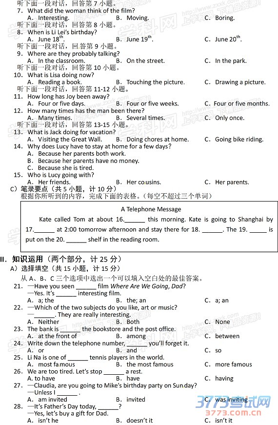 [组图]2015益阳中考英语试题及答案评分标准发布