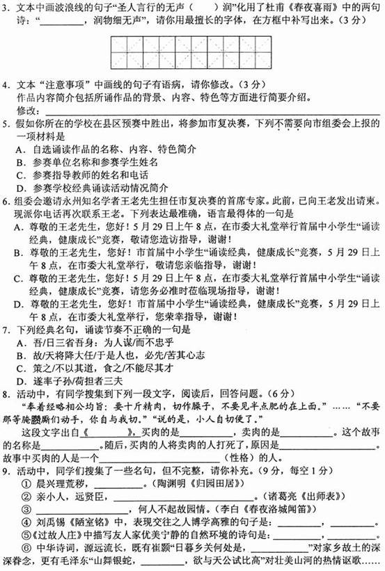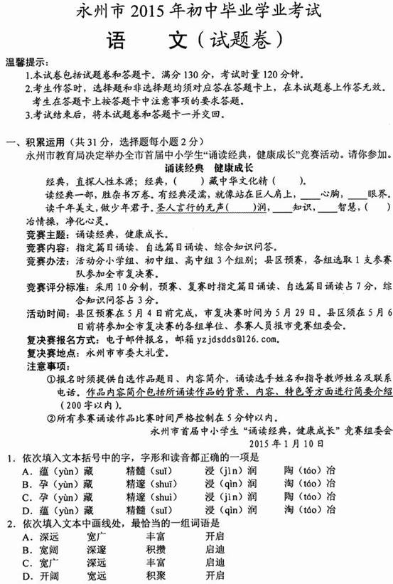 [组图]2015永州中考语文试题真题