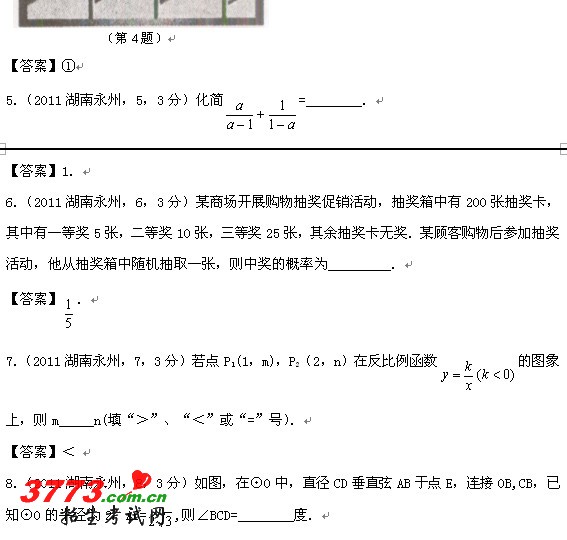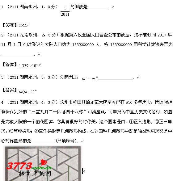 2011年湖南省永州市初中毕业学业考试试题(数学)