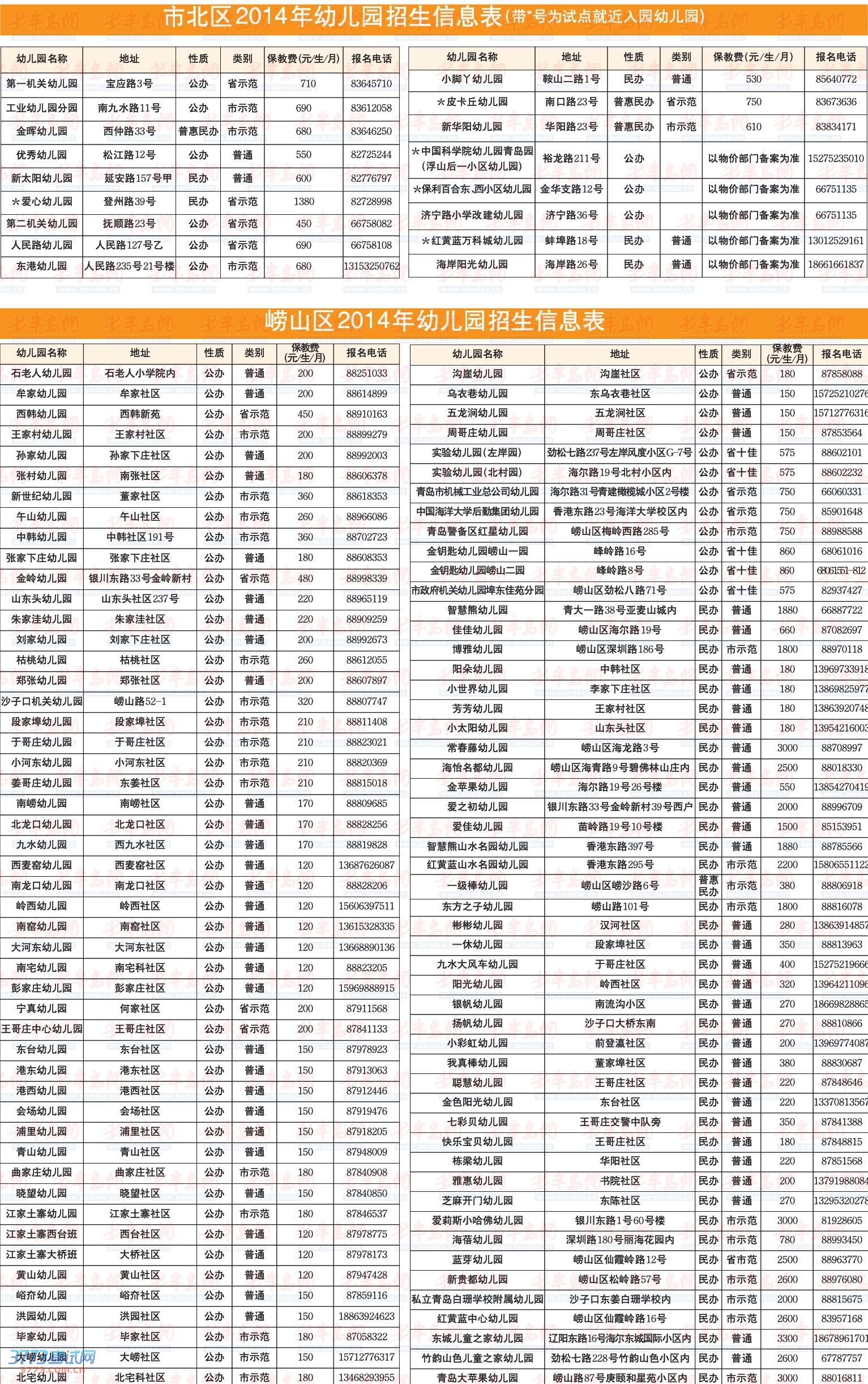 据了解,市南区2014年秋季面向社会招收小班幼儿的幼儿园(班)共有57处,其中公办园34处,普惠性民办园5所,民办幼儿园8所,特殊教育幼儿园1所,幼儿班9个。记者发现,今年的招生幼儿园数量比去年新增了24所,增幅达7成多。