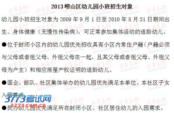 6月10日现场报名 据了解,2013年崂山区幼儿园小班招生对象为2009年9月1日至2010年8月31日期间出生、身体健康(无慢性传染病),可正常参加集体活动的适龄幼儿。